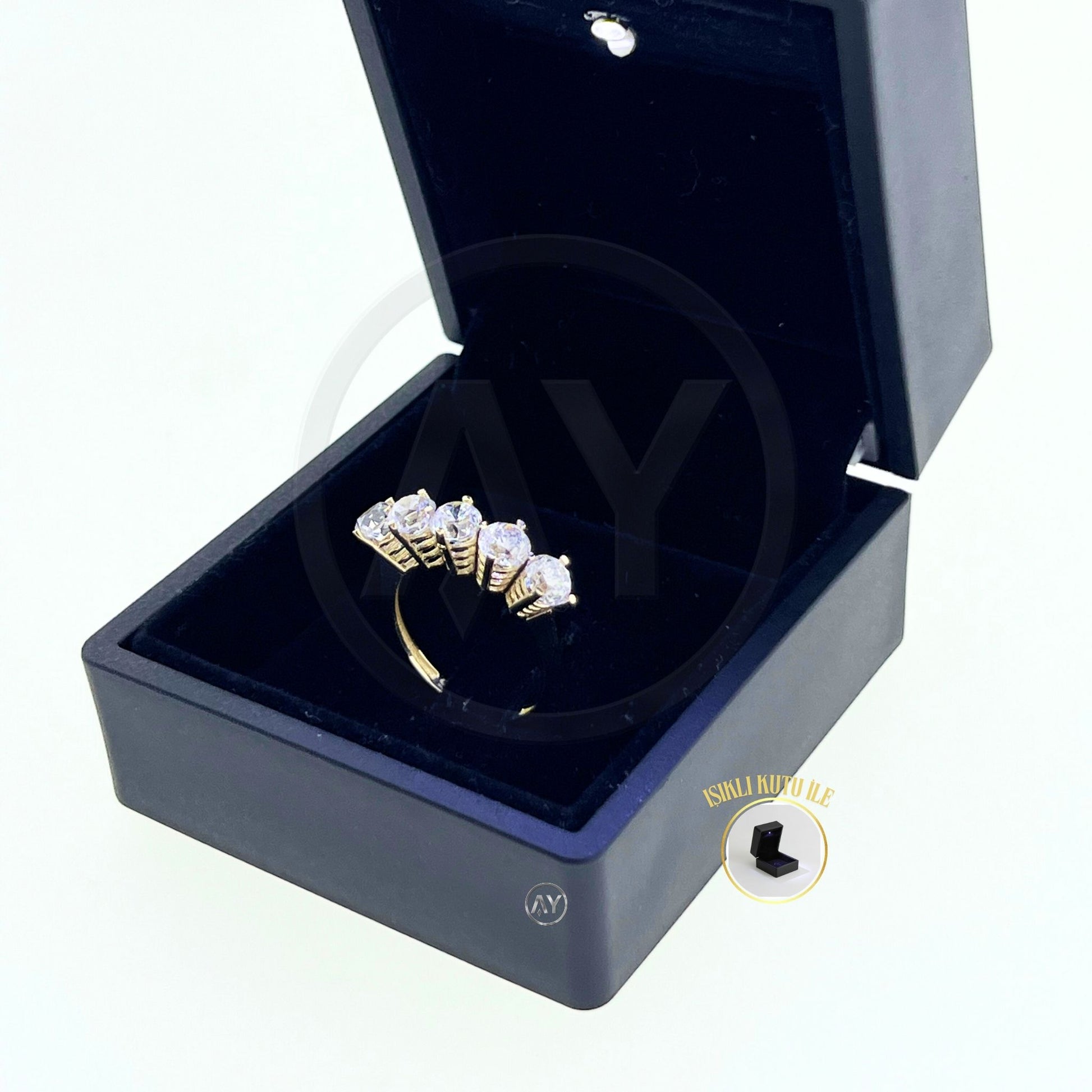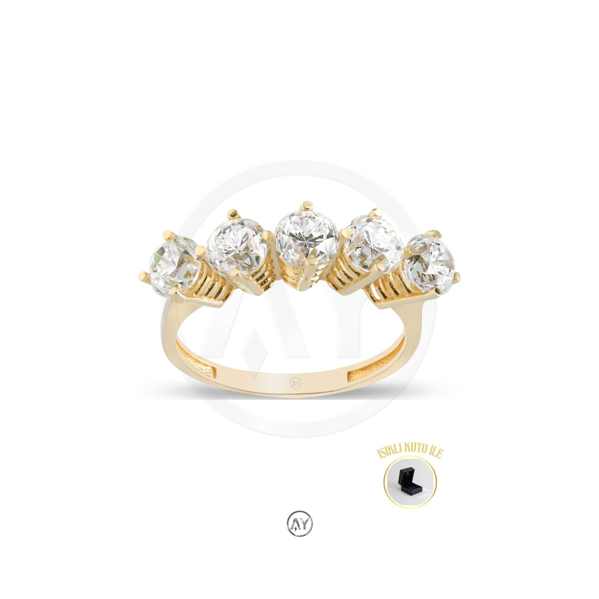 - 14 Ayar Altın Yüzük – 3.40 Gr. | Sarı Altın Zirkon Beştaş Yüzük, Işıklı Kutulu & Garanti Belgeli & Karton Çantalı